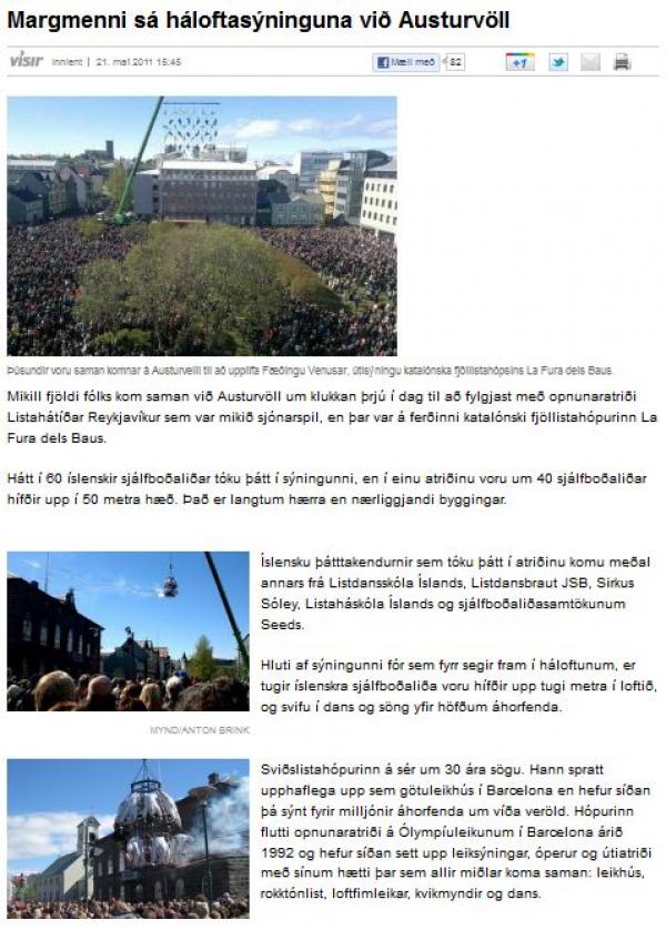 Mikill fjöldi fólks kom saman við Austurvöll um klukkan þrjú í dag til að fylgjast með opnunaratriði Listahátíðar Reykjavíkur sem var mikið sjónarspil, en þar var á ferðinni katalónski fjöllistahópurinn La Fura dels Baus.